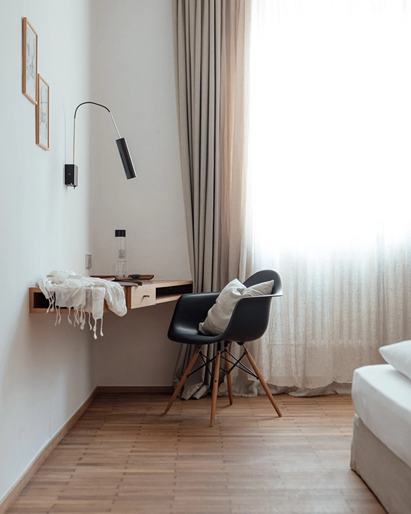 Elegantes, lichtes Stadtzimmer, hohe Räume. Echtholz-Parkettboden, dezenter Schreibtisch. Designerbett von „Plinio il Giovane“ mit bequemer Matratze. Schlichtes Bad mit Naturstein und hochwertigen Armaturen.
