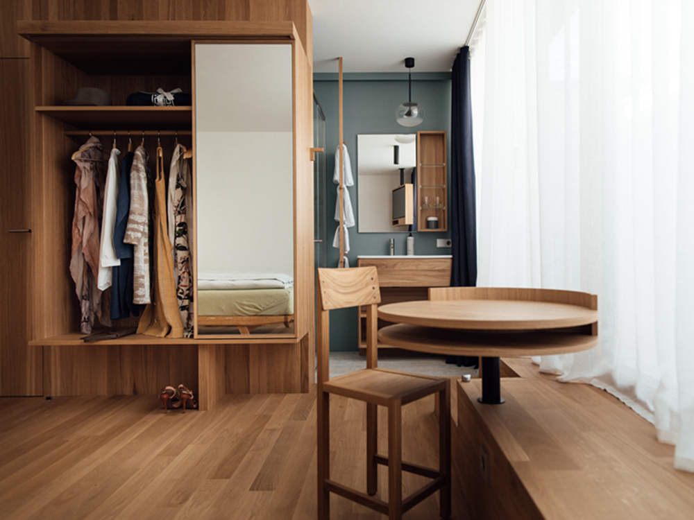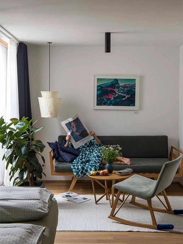 Helles Designzimmer mit Wohnecke, Eichenholzboden und Designermöbeln von „Plinio il Giovane“. Feine Bettwäsche aus Jacquardbaumwolle. Designer Schlafcouch von Plinio il Giovane. Bad in Silberquarzit. 3 m2 Loggia. Drittes und viertes Bett möglich.