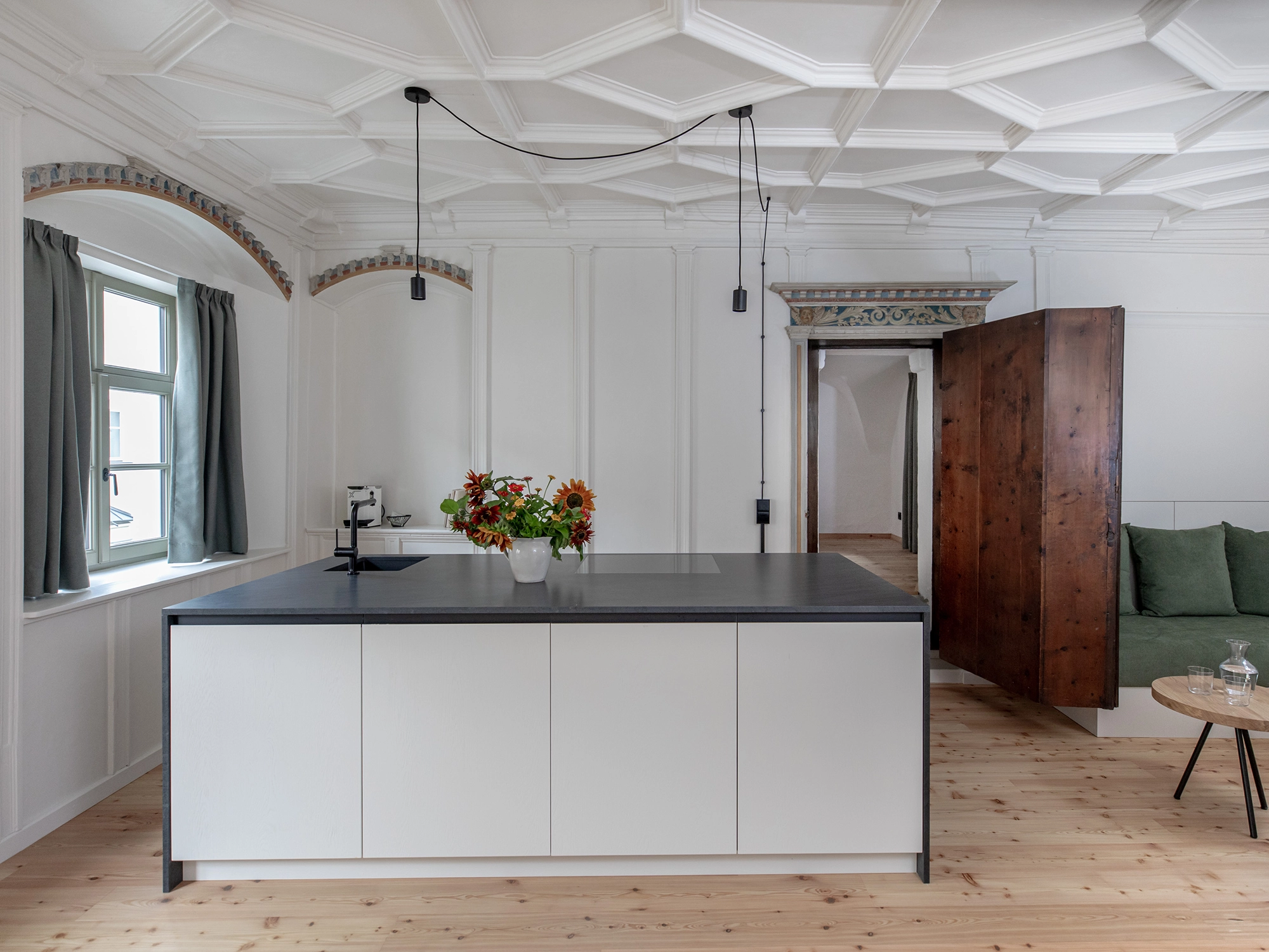Unsere 10 Apartments befinden sich mitten in der lebendigen Altstadt von Sterzing. Dort, wo einst Ida in ihrem Kurzwarenladen Knöpfe sortierte. Heute verschmelzen hier Vergangenheit, Eleganz und Design zu einem harmonischen Ganzen. Die Gemäuer aus dem 14. Jahrhundert haben sich verwandelt: Die gotischen Stuben mit ihren Sternrippengewölben und kunstvoll verzierten Gebälken wurden behutsam modernisiert; große Fenster lassen viel Tageslicht herein und schaffen eine gemütliche Atmosphäre. Willkommen zu einer besonderen Auszeit – um zu entspannen oder Stadt und Natur zu entdecken.