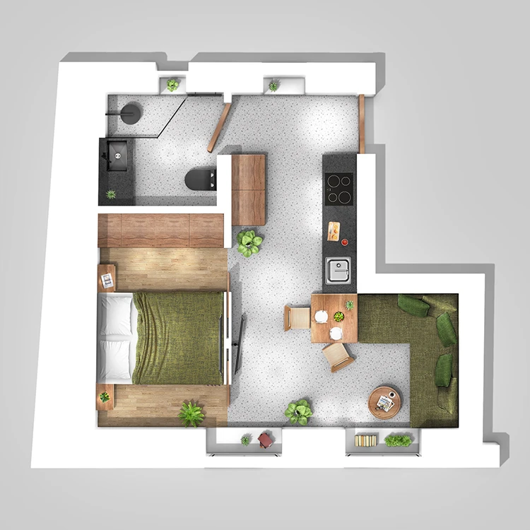 Helles Komfortstudio mit voll ausgestatteter Küche, gemütlicher Wohnecke und hochwertigem Badezimmer mit Dusche. Der Schlafbereich ist durch eine Trennwand separiert. Das Studio liegt an der ruhigen Kapuzinergasse.