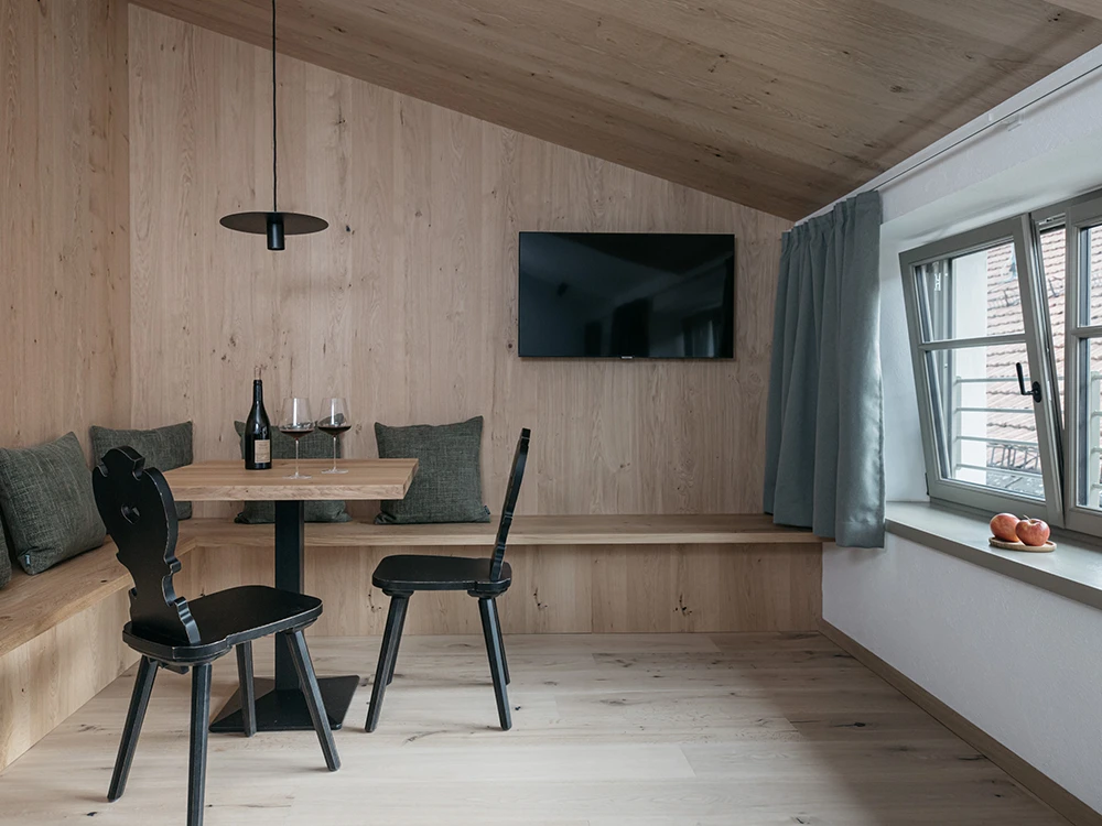 Apartment im Dachgeschoss zur Stadtseite mit hellen Panorama-Dachluken. Zwei getrennte Schlafzimmer, großes hochwertiges Badezimmer mit Dusche, voll ausgestattete Küche, gemütliche Doppel-Schlafcouch im Wohnraum, Tiroler Stubenecke mit Blick auf die historische Neustadt.